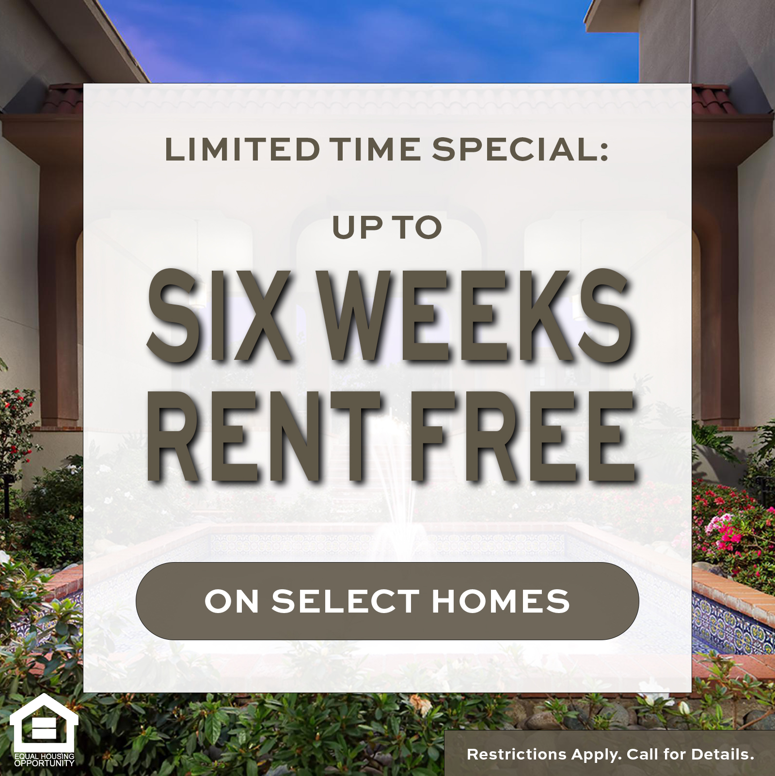 This special is active on select apartments only for a limited time and is subject to cancellation without notice. Terms & restrictions apply. Please contact the leasing office for more information. Equal Housing opportunity.